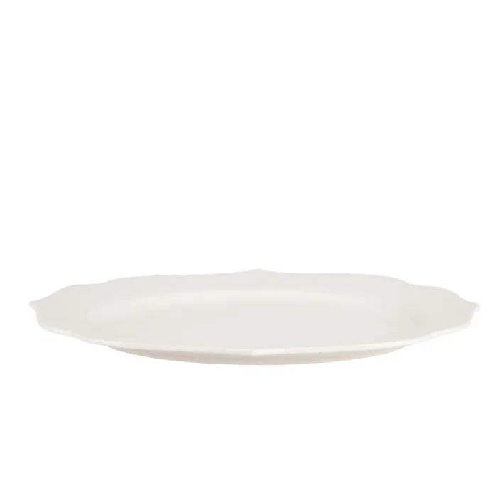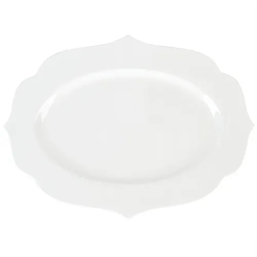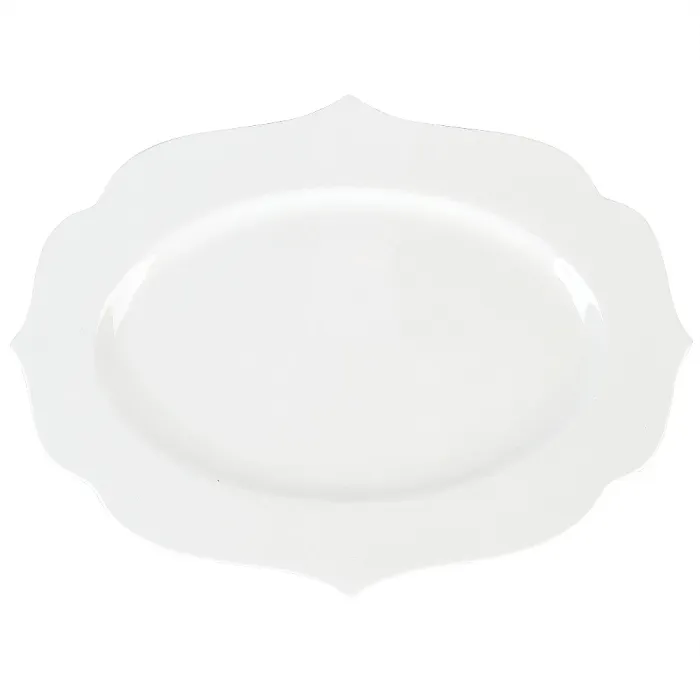 Блюдо изготовлено из белого фарфора, что обеспечивает прочность и гигиеничность. Поверхность изделия гладкая. Блюдо имеет фигурную форму, а его конструкция с низкими бортиками облегчает сервировку и подачу пищи.