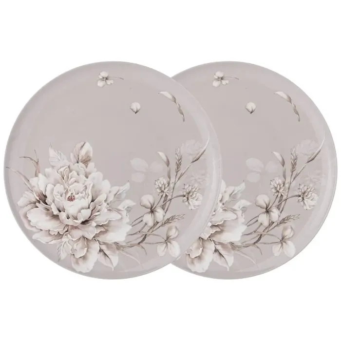 Тарелки выполнены из костяного фарфора, материала, известного высокой прочностью и белизной. Поверхность украшена декором в виде белого цветка на сером фоне. Конструктивно изделия представляют собой классические обеденные тарелки с ровным бортиком.