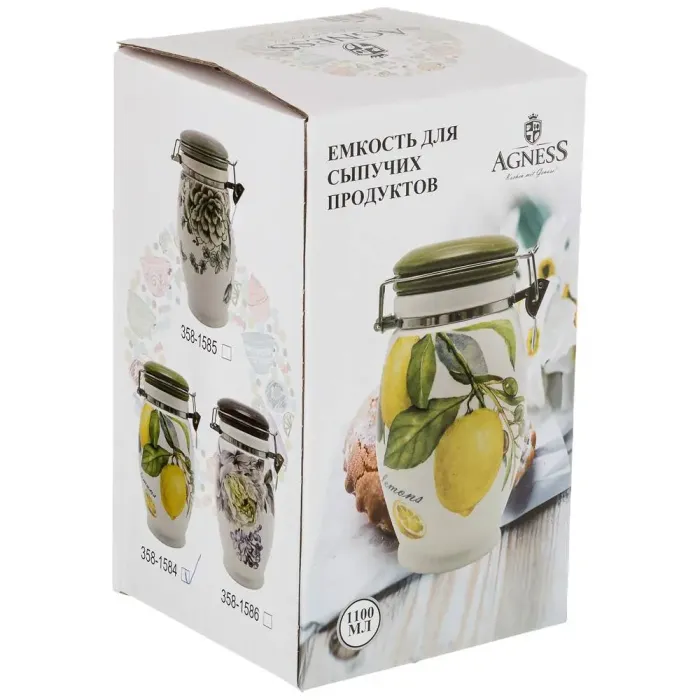 Ёмкость для сыпучих продуктов из серии «Лемон Три» от Agness предназначена для хранения различных круп, сахара или муки. Она отличается оригинальным дизайном и станет стильным акцентом на кухне. Изготовленная из доломитовой керамики, ёмкость сочетает в себе прочность и лёгкость.