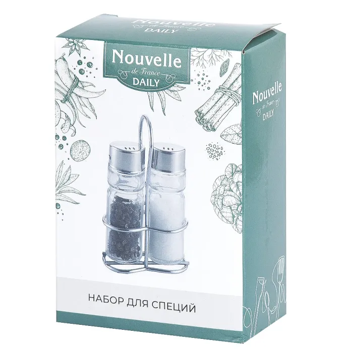Солонка и перечница имеют цилиндрическую форму, что обеспечивает удобство использования. Прозрачное стекло позволяет легко контролировать уровень содержимого. Подставка обеспечивает устойчивость набора на любой поверхности. Комплект упакован в цветную коробку, что делает его подходящим для подарка.