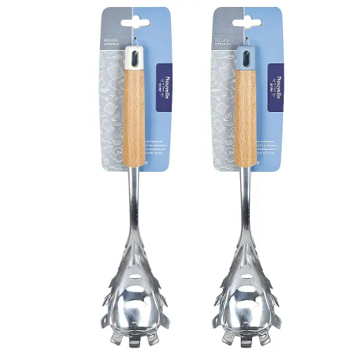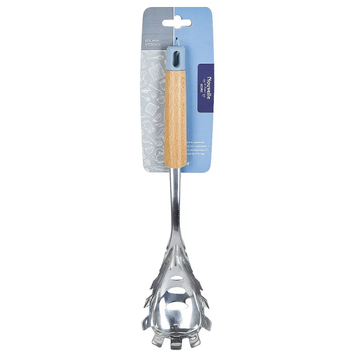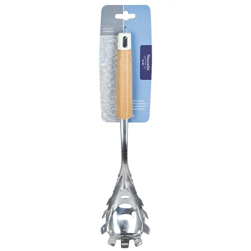 Рабочая часть ложки изготовлена из нержавеющей стали, что обеспечивает прочность и гигиеничность. Ручка комбинированная: состоит из обработанного бука, приятного на ощупь, и полипропилена. Конструкция включает отверстие для подвешивания, что облегчает хранение на кухне.