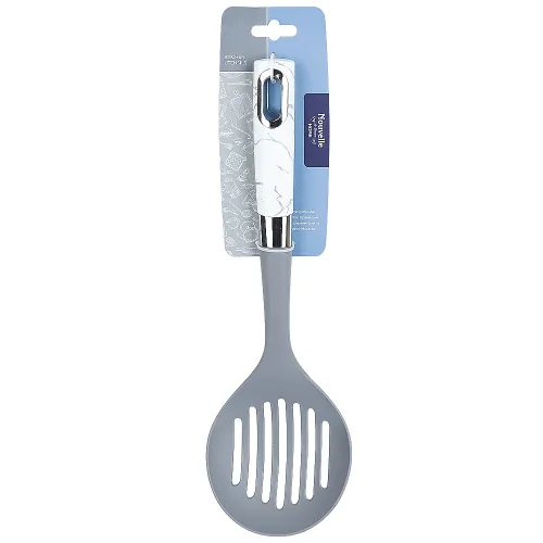 Рабочая часть изделия изготовлена из нейлона, термостойкость которого составляет до 210°C. Ручка из полипропилена имеет эргономичную форму и отверстие для подвешивания. Визуальный эффект мрамора достигается за счёт технологии окрашивания полимерных материалов.