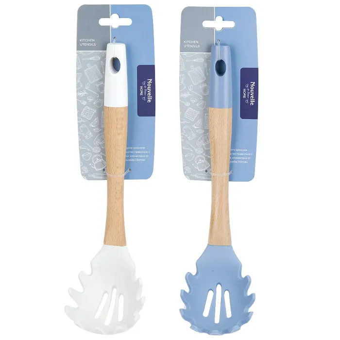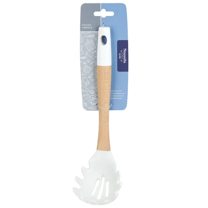 Ложка для спагетти Emborio Silicone предназначена для удобного извлечения и сервировки пасты. Инструмент сочетает прочную буковую ручку с гибкой силиконовой рабочей частью, что обеспечивает долговечность и комфорт в использовании.