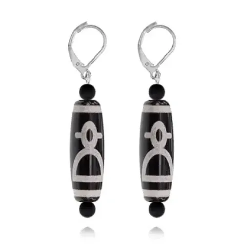 Серьги с бусинами Дзи Кубера. Изготовлены вручную из натурального агата.