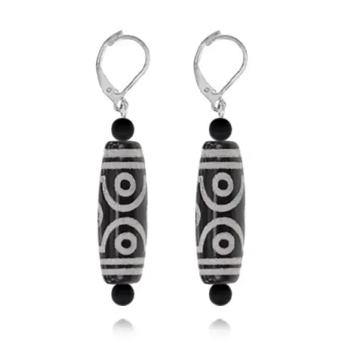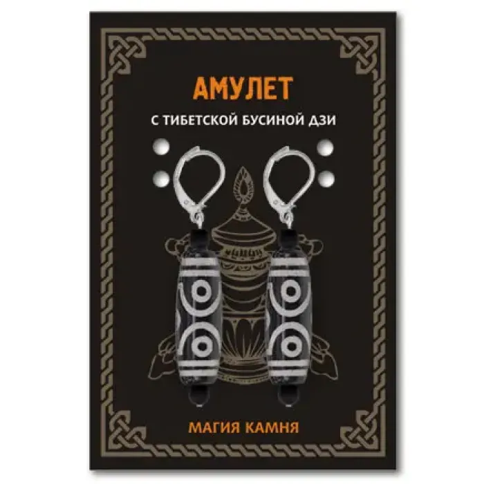 Серьги с бусиной Дзи. Изготовлены из натурального агата, украшены шестиглазым узором.