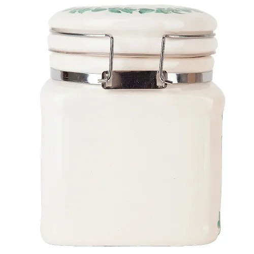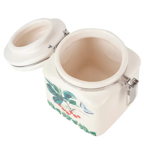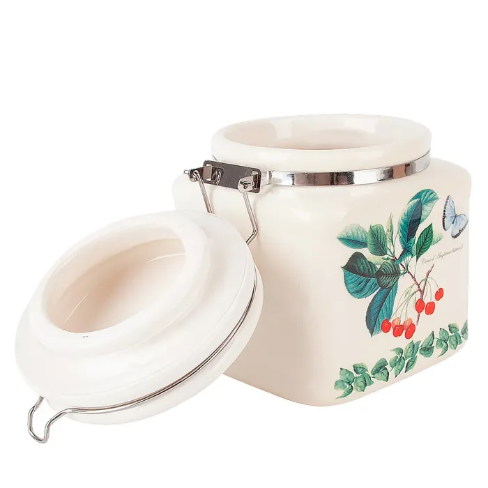 Банка изготовлена из керамики, материала, отличающегося прочностью и устойчивостью к внешним воздействиям. Прямоугольная форма корпуса с размерами 12х9,5х12 см позволяет компактно размещать её на полках. Крышка с клипсовым механизмом фиксируется плотно, что способствует сохранению свежести содержимого. Декоративное оформление выполнено в тематике Fruit Garden.