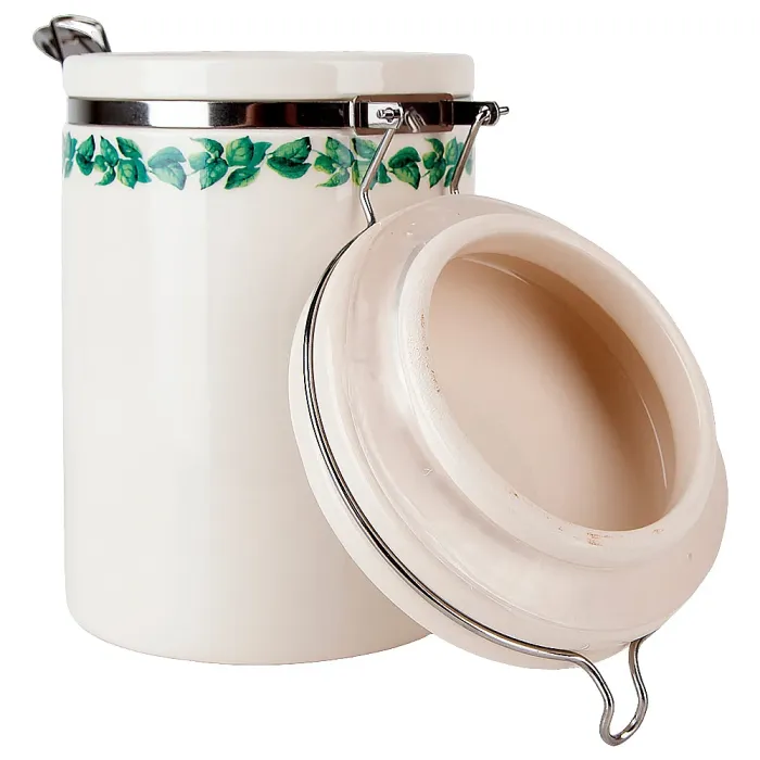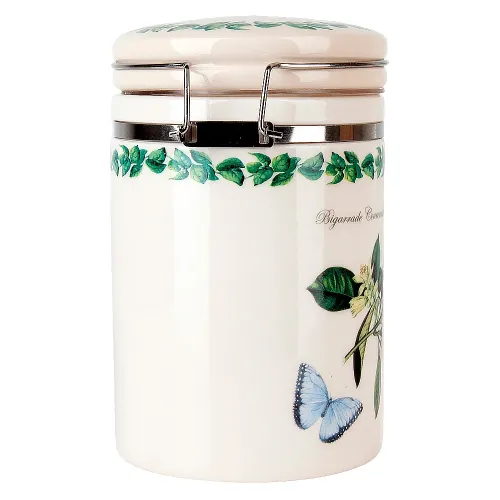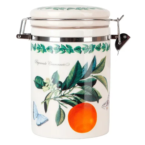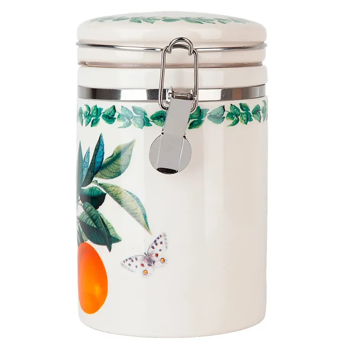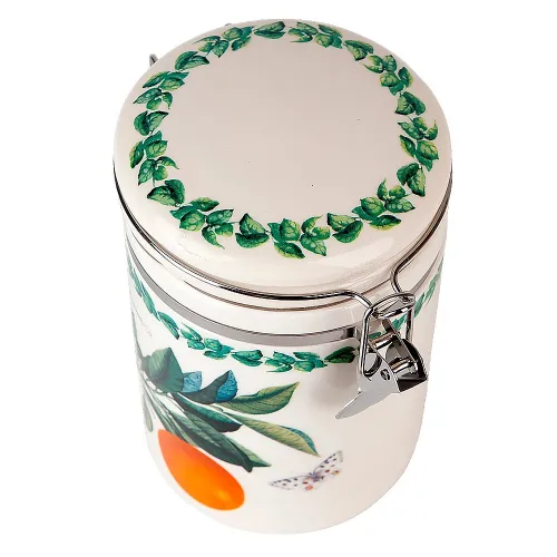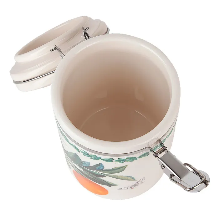 Банка изготовлена из керамики, материала, устойчивого к воздействию пищевых продуктов. Крышка с клипсой обеспечивает герметичное закрытие, что способствует защите содержимого от влаги и посторонних запахов. Дизайн украшен рисунками животных в стиле коллекции Fruit Garden.