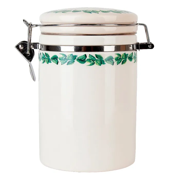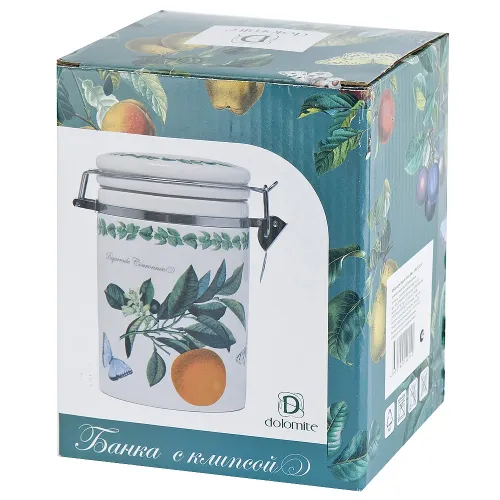 Керамическая банка для сыпучих продуктов с клипсой предназначена для хранения круп, сахара, кофе и других сыпучих продуктов. Изделие из коллекции Fruit Garden торговой марки Dolomite отличается функциональной конструкцией и декоративным оформлением.