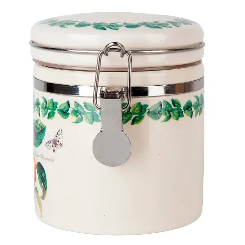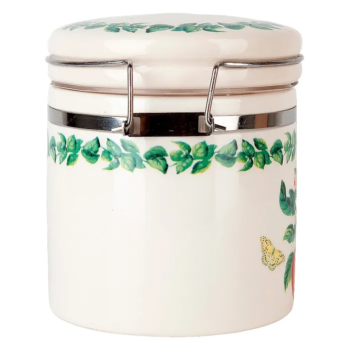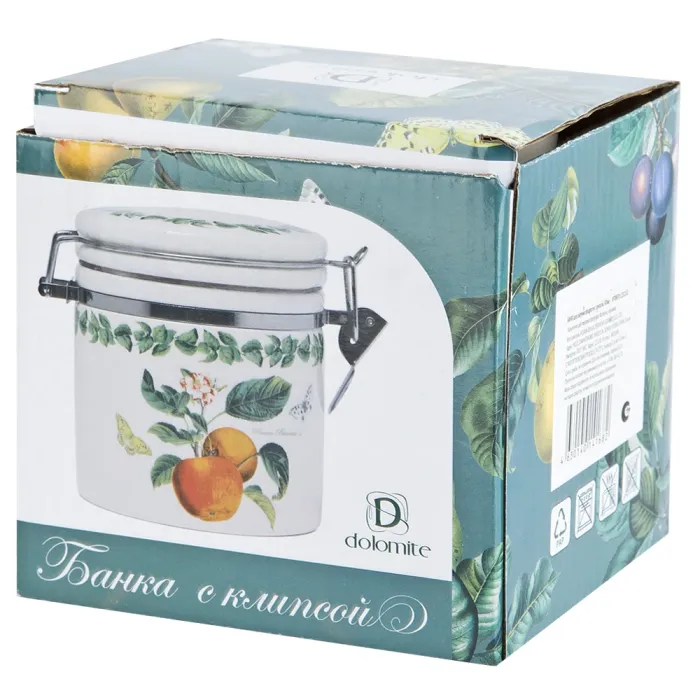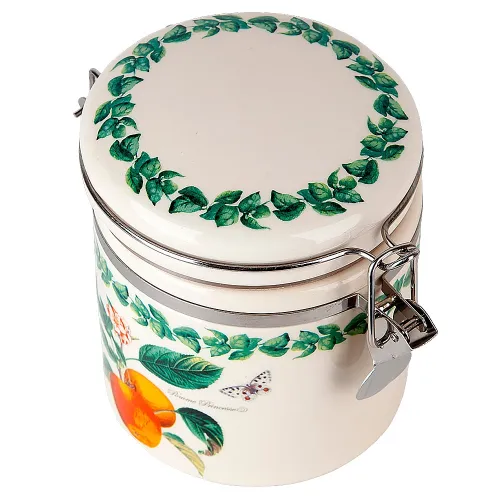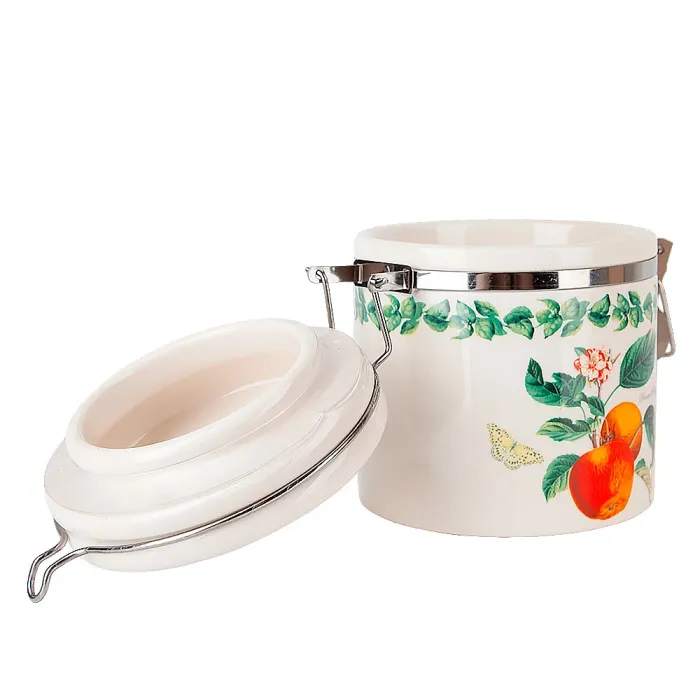 Изделие изготовлено из керамики, материал обладает гигиеничностью и устойчивостью к окрашиванию. Корпус банки украшен декоративным рисунком с фруктами. Клипсовый механизм крышки обеспечивает плотное прилегание и удобство открывания.