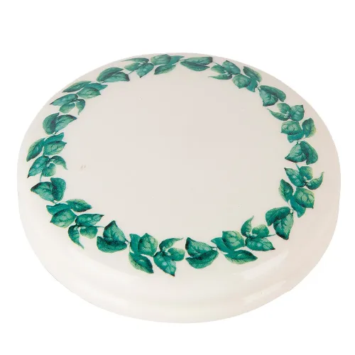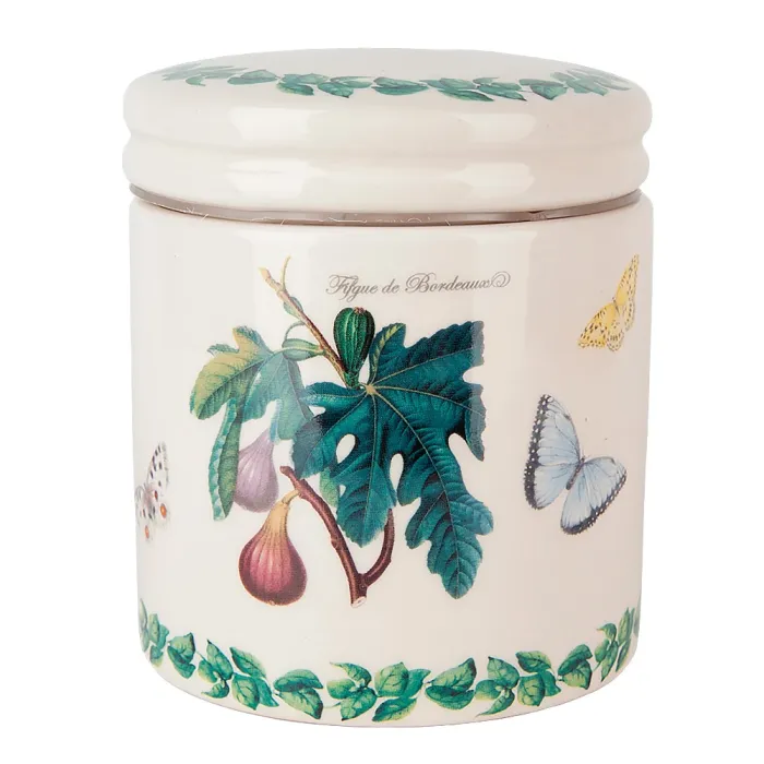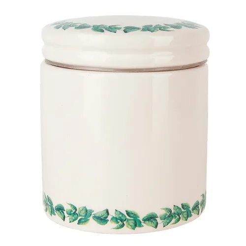 Банка изготовлена из керамики, что обеспечивает гигиеничность и устойчивость к внешним воздействиям. Форма бочонка с удобными боковыми стенками способствует компактному размещению. Декоративное изображение нанесено на поверхность изделия.