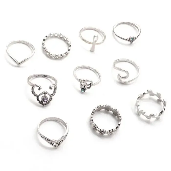 Набор колец KLN014 — это стильный комплект из нескольких уникальных дизайнов и размеров, который станет отличным дополнением к любому образу. Изготовленные из качественного металла с элегантным серебристым оттенком, эти кольца идеально подходят для создания модных акцентов в повседневной жизни или на особых мероприятиях.