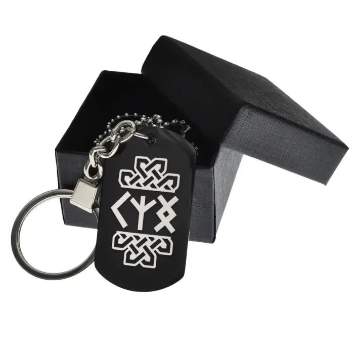 Черный жетон с руническими символами, выполненный из нержавеющей стали с чернением и гравировкой.