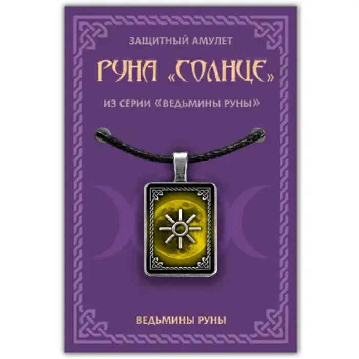 Амулет 'Руна Солнце' — это позитивный ведьмин знак, символизирующий начало нового пути и предвещающий удачу в делах. Он ассоциируется с ростом, плодородием и творчеством, а также традиционно используется для развития и получения новых знаний. Ясность и чёткость восприятия — ещё одни качества, которые приписываются этому амuletу. В комплект входят шнурок и вкладыш с описанием. Упаковка выполнена из прозрачного полипропилена с европодвесом для удобства размещения на торговом оборудовании. Руны ведьм считаются мощными эзотерическими инструментами в викканской магии, используемыми для гадания, защиты и помощи в повседневных делах.