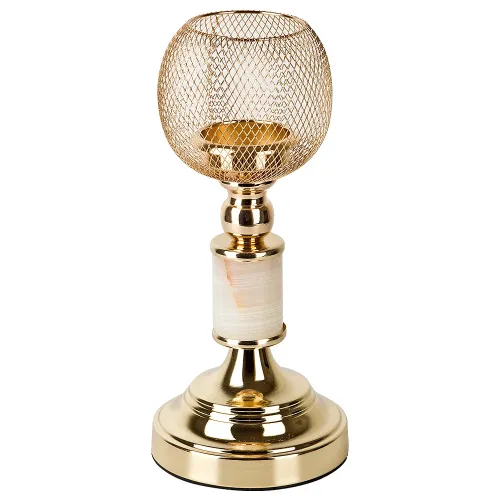 Декоративный подсвечник предназначен для размещения стандартной свечи. Изделие имеет фигурную форму и золотистый цвет.