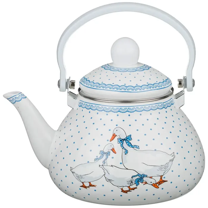 Для сохранения внешнего вида эмалированного покрытия и декора следует использовать мягкие губки. Чайник серии «Гуси» может стать акцентным предметом на кухне в стиле кантри, прованс или в классическом интерьере.