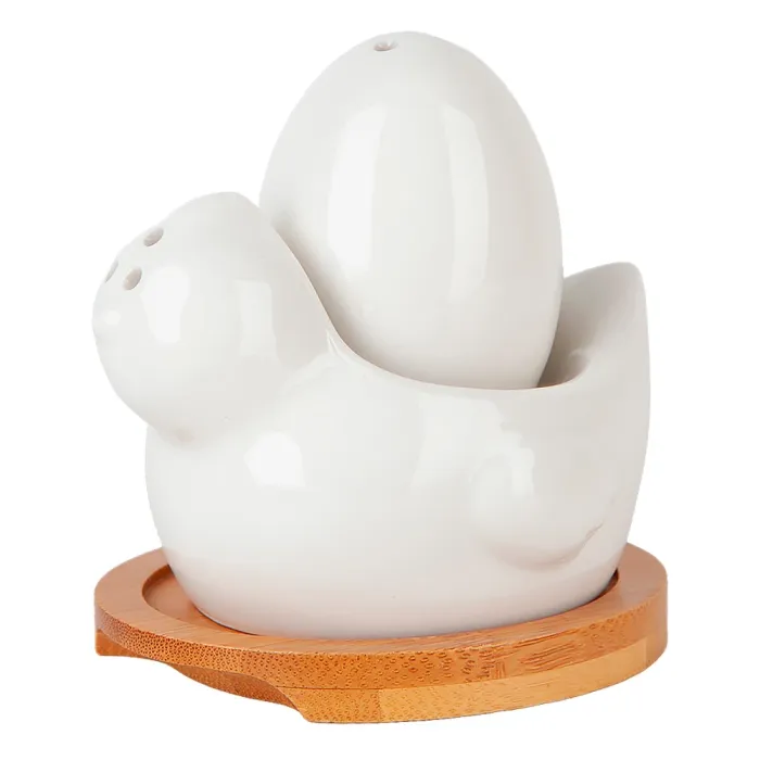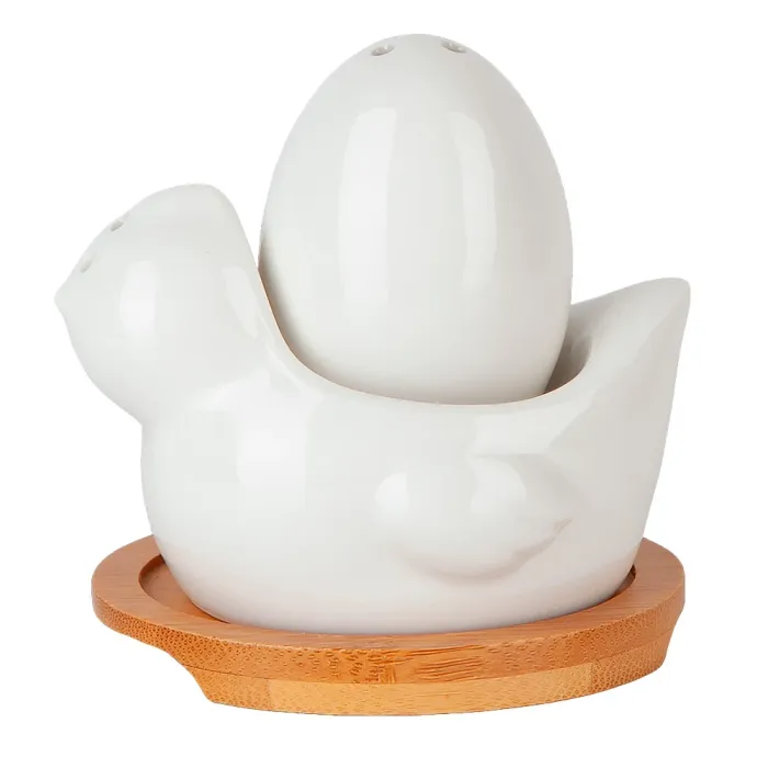 Емкости для специй изготовлены из фарфора, что обеспечивает гигиеничность и устойчивость к окрашиванию. Подставка выполнена из бамбука, придавая комплекту устойчивость и натуральный вид. Конструкция включает две отдельные емкости с крышками, закрепленные на общей подставке.