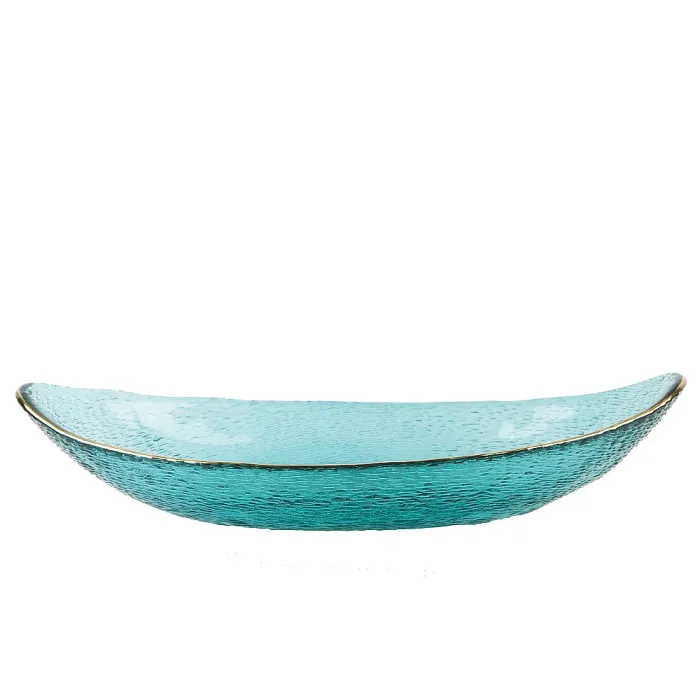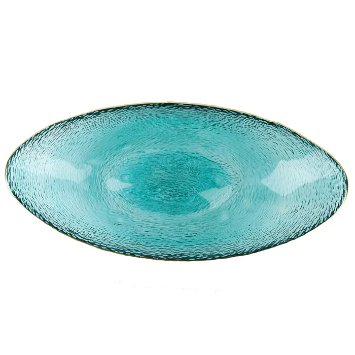 Блюдо выполнено из прочного стекла, которое обеспечивает устойчивость к внешним воздействиям. Поверхность украшена рельефным рисунком в виде полос и золотым декором по краю. Овальная форма и низкие бортики облегчают сервировку и доступ к содержимому.