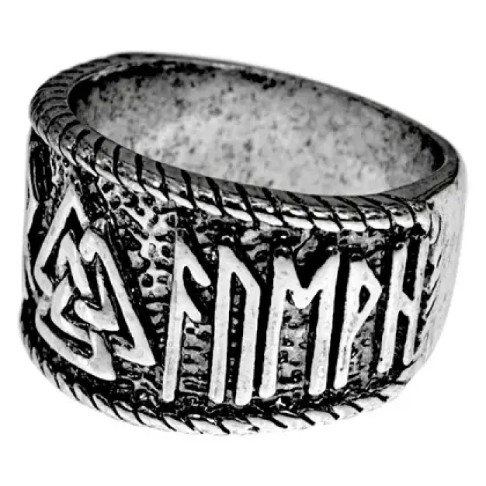 Кольцо с символом Валькнут и рунами, размер 9. Изготовлено из металла с покрытием под серебро.