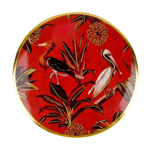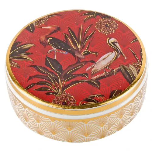Декоративная шкатулка Casablanca из фарфора торговой марки Nouvelle Home. Изделие круглой формы украшено рисунком с птицами и золотыми элементами, служит для хранения мелочей или в качестве интерьерного акцента.