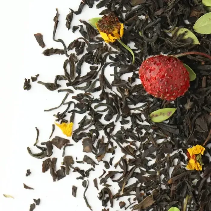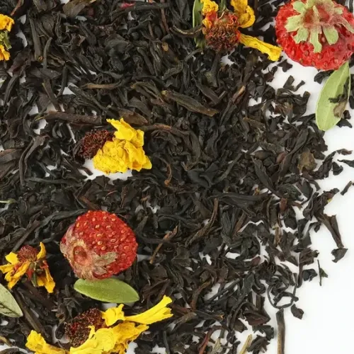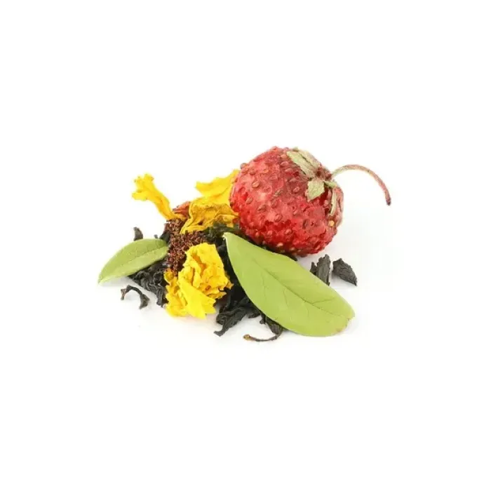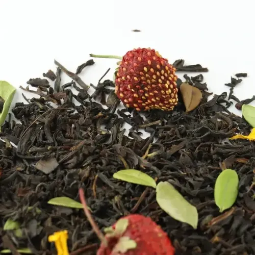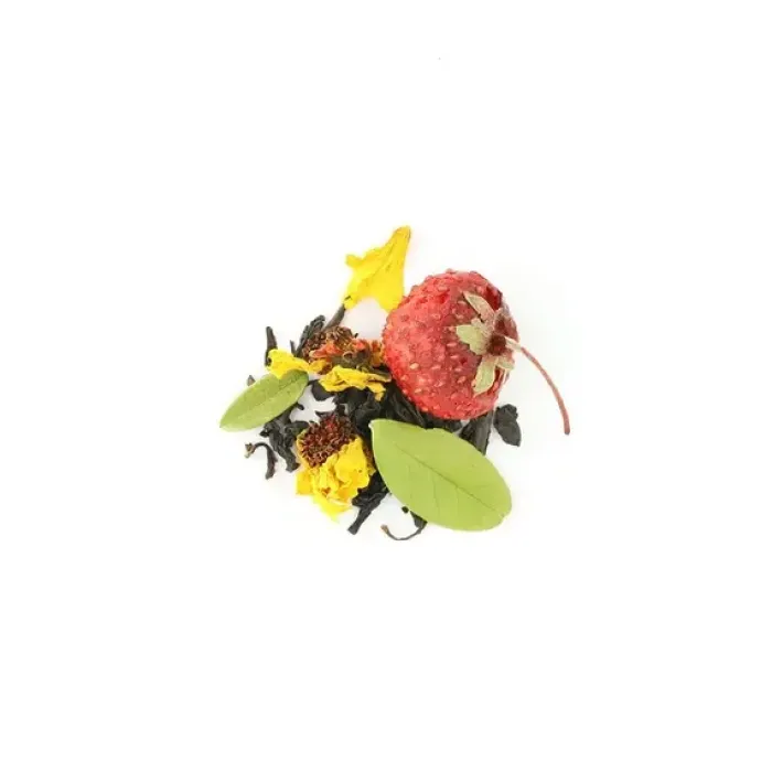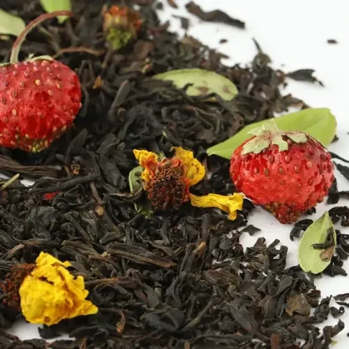 Состав: среднелистовой чёрный чай, ягоды клубники, цветы хризантемы, листья брусники (для лёгкой терпкости), ароматизатор «клубника со сливками».
