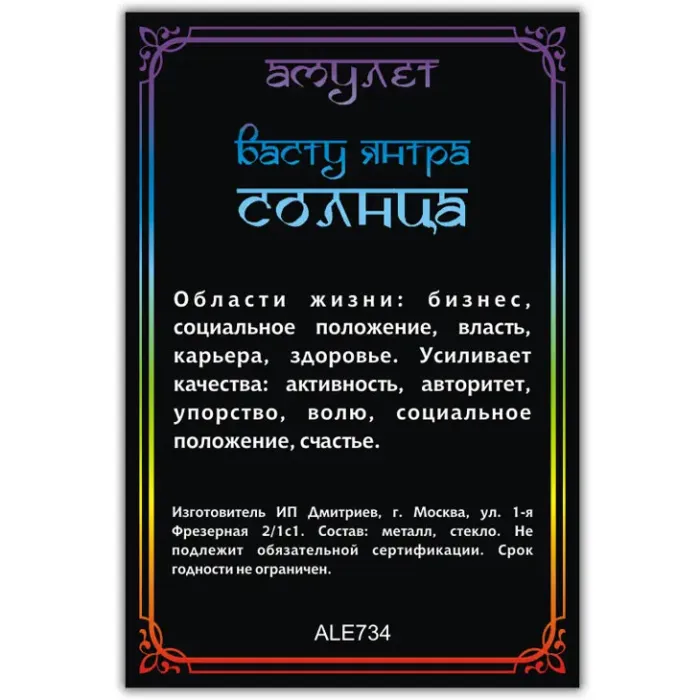 Амулет Васту янтра Солнца — это уникальный квадратный сувенир, который сочетает в себе духовное значение и эстетическую привлекательность. Этот амулет традиционно используется для привлечения положительной энергии и гармонии в жизни.