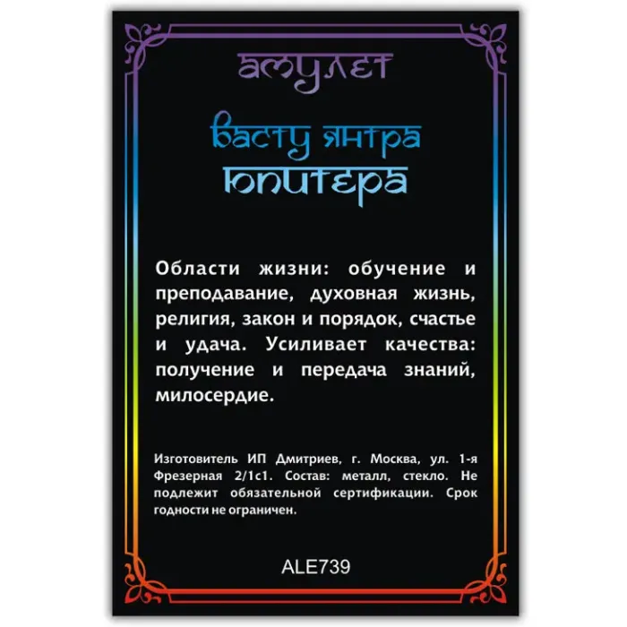Амулет Васту янтра Юпитера — это уникальный квадратный аксессуар, который сочетает в себе эстетическую красоту и глубокий символизм. Этот амулет традиционно используется для привлечения благоприятной энергии и защиты от негативных влияний.