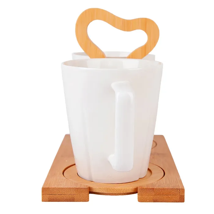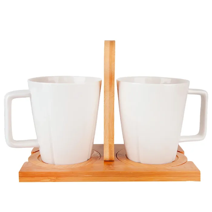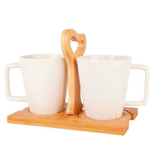 Кружки изготовлены из фарфора, что обеспечивает их прочность и гигиеничность. Подставка выполнена из натурального бамбука. Конструкция набора включает две кружки и отдельную подставку для их хранения, что способствует организации пространства.