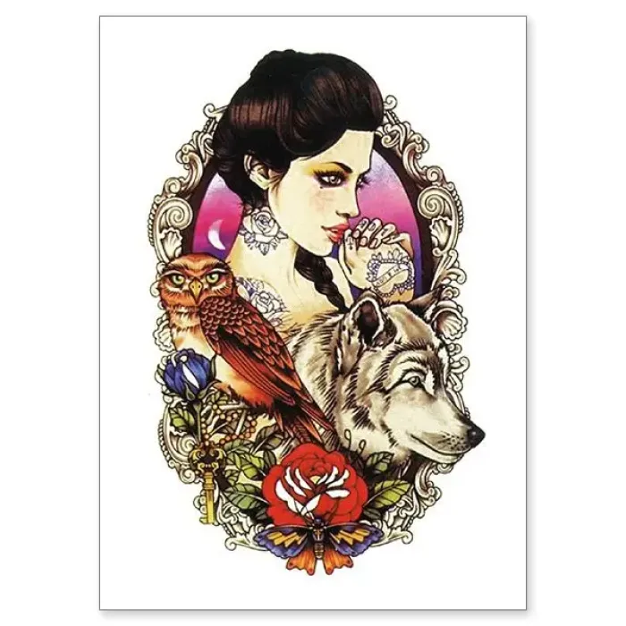 Временная татуировка-переводка с изображением девушки, совы и волка для кратковременного украшения кожи.