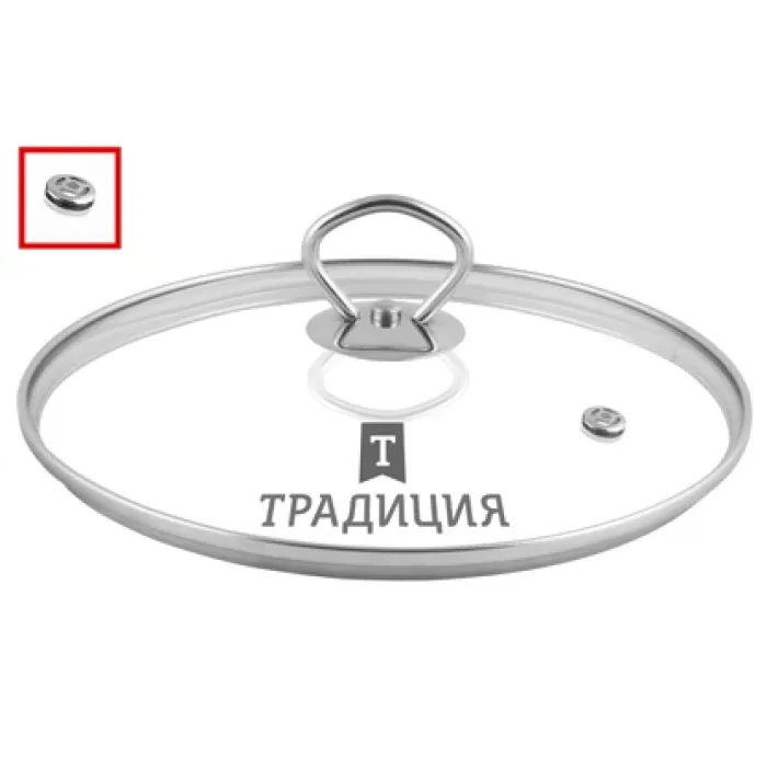 Крышка изготовлена из термостойкого стекла, устойчивого к высоким температурам. Металлический ободок по краю выполнен из нержавеющей стали и служит для защиты стекла от сколов и механических повреждений. Эргономичная ручка из того же материала обеспечивает безопасный и удобный захват. В центре крышки расположен пароотвод диаметром 1,5 см с кнопкой, который регулирует выход пара во время готовки.