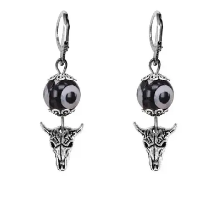 Серьги Череп быка (сила, мужество, защита), бусины Дзи из агата SE-MKA35-2076