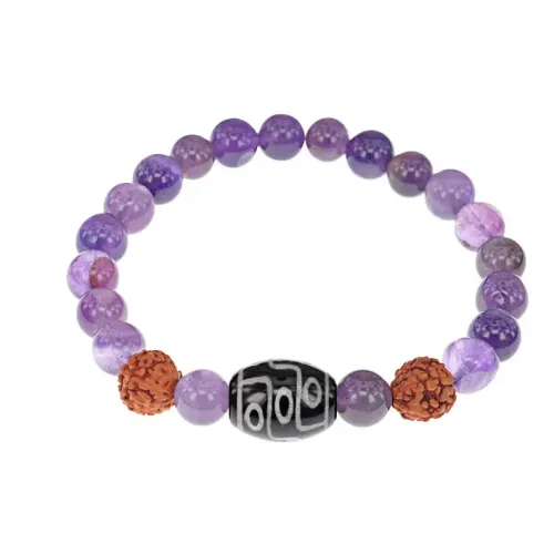 Браслет с 9-глазой Дзи, нат. рудракшей и синт. камнем Аметист BSDR-01-03