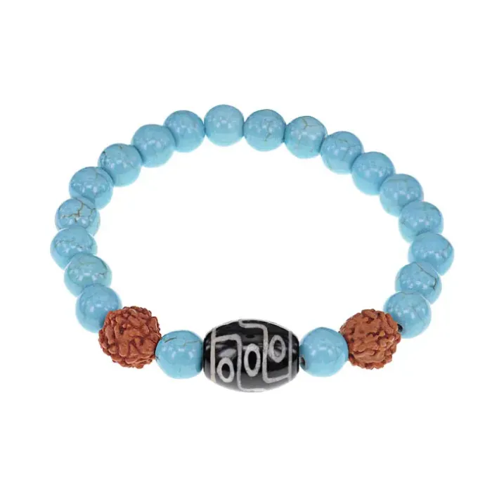 Браслет-сувенир, сочетающий бусину Дзи, рудракшу и синтетическую бирюзу на стрейч-основе.