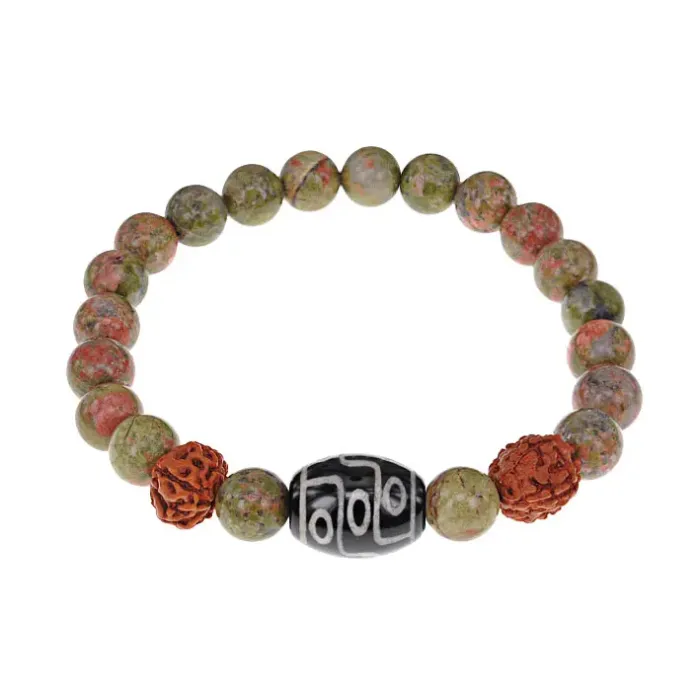 Браслет для ношения, состоящий из бусин: тибетской Дзи из агата, рудракши и синтетического унакита.