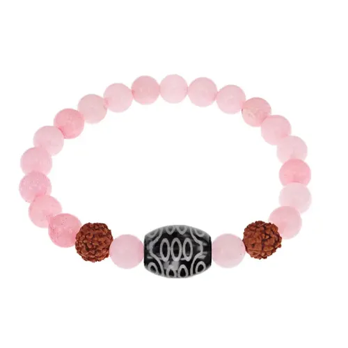 Стрейч-браслет для ношения в качестве сувенира или аксессуара. Изготовлен из натуральной рудракши, бусины Дзи из агата и синтетического розового кварца.