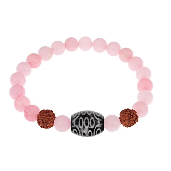Браслет с 21-глазой Дзи, нат. рудракшей и синт. камнем Розовый кварц BSDR-02-15