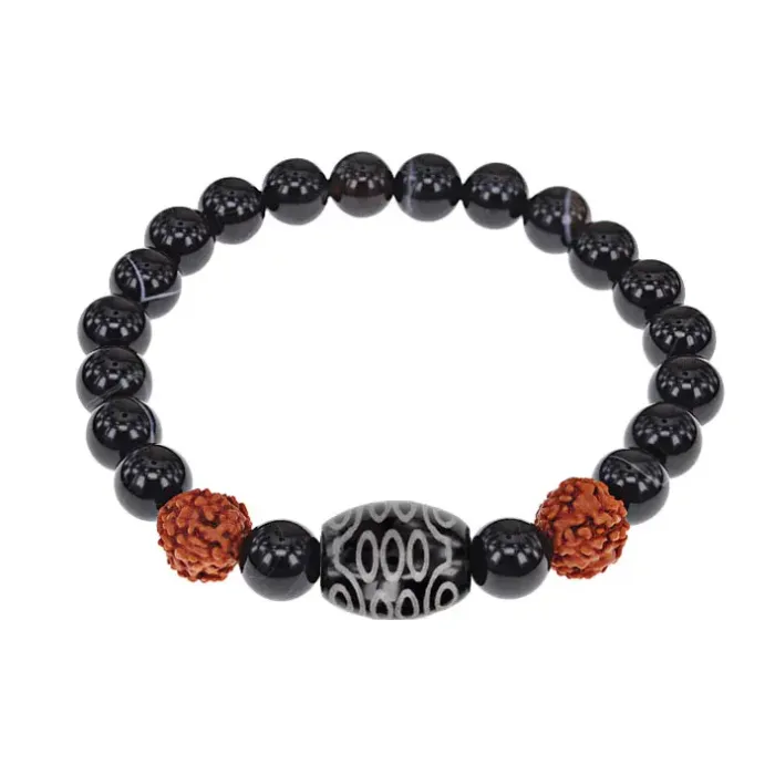 Браслет с 21-глазой Дзи, нат. рудракшей и синт. камнем Черный агат BSDR-02-23