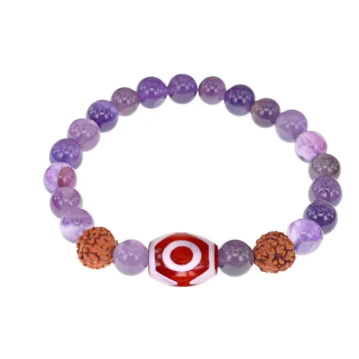 Браслет с 3-глазой Дзи, нат. рудракшей и синт. камнем Аметист BSDR-03-03