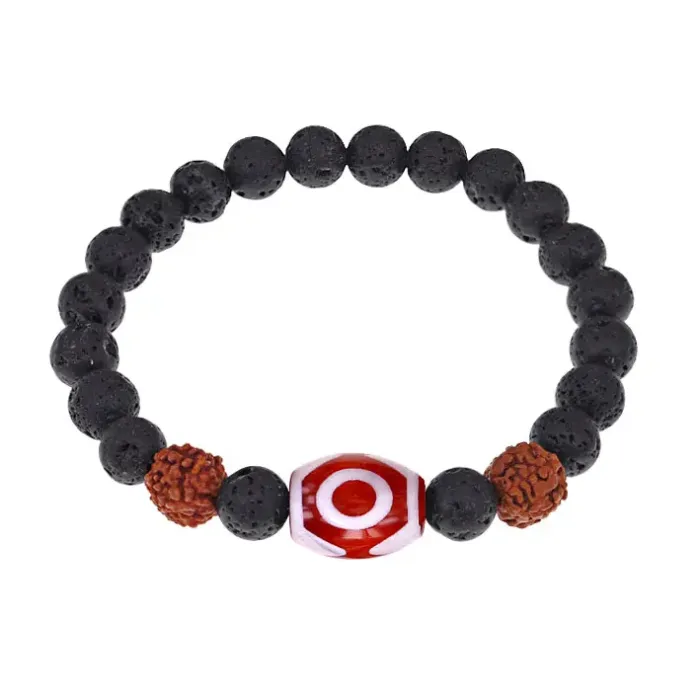 Стрейч-браслет для ношения, сочетающий натуральную рудракшу, синтетический камень лава и бусину Дзи из агата.