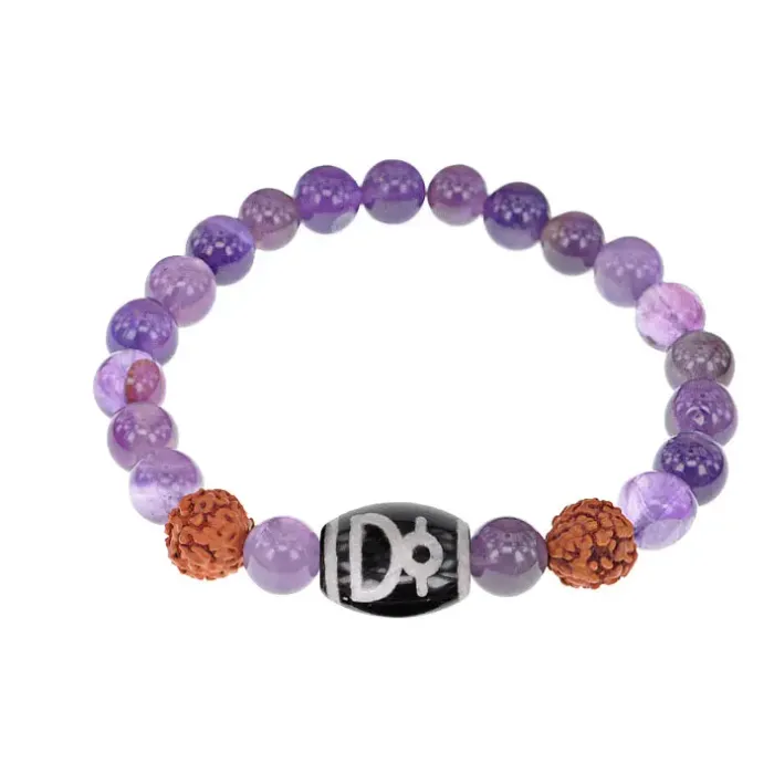 Браслет с бусиной Дзи Кубера, изготовленный из натуральной рудракши и синтетического аметиста.