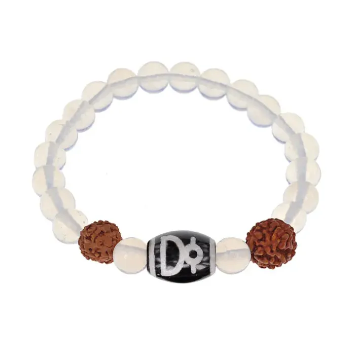 Браслет с Дзи Кубера, нат. рудракшей и синт. камнем Лунный камень BSDR-04-11