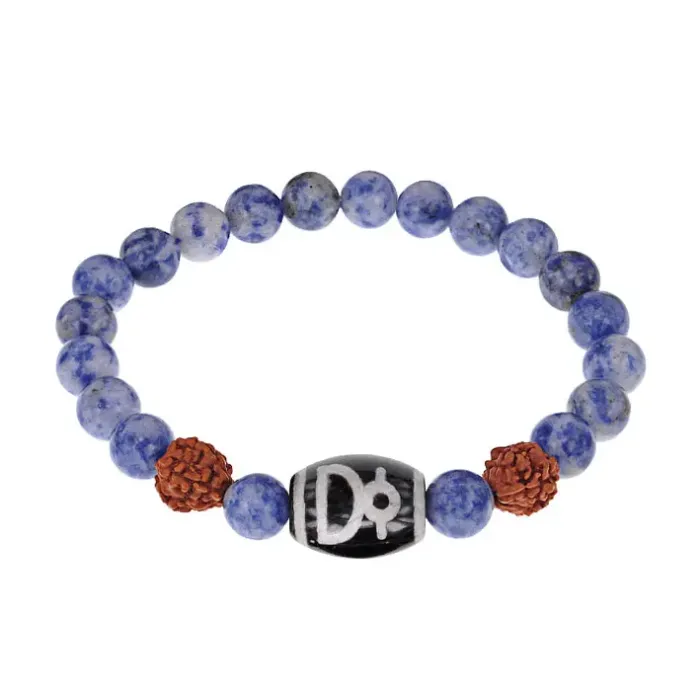 Стрейч-браслет с бусиной Дзи Кубера, натуральной рудракшей и синтетическим содалитом.