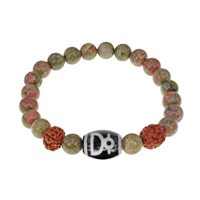 Браслет с Дзи Кубера, нат. рудракшей и синт. камнем Унакит BSDR-04-20