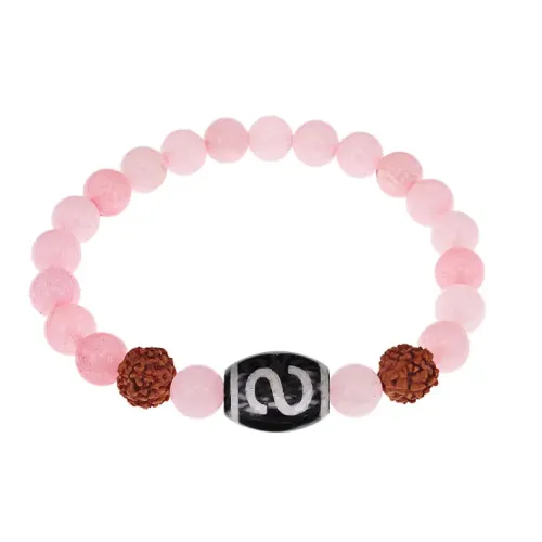 Стрейч-браслет с бусинами из натуральных и синтетических материалов, включая бусину Дзи, рудракшу и розовый кварц.