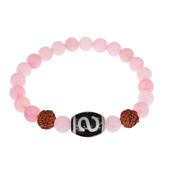 Браслет с Дзи Денежный крючок, нат. рудракшей и синт. камнем Розовый кварц BSDR-05-15