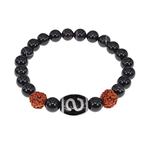 Браслет с Дзи Денежный крючок, нат. рудракшей и синт. камнем Черный агат BSDR-05-23