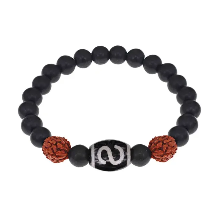 Стрейч-браслет для ношения в качестве аксессуара, сочетающий бусину Дзи из агата, натуральную рудракшу и синтетический камень шунгит.