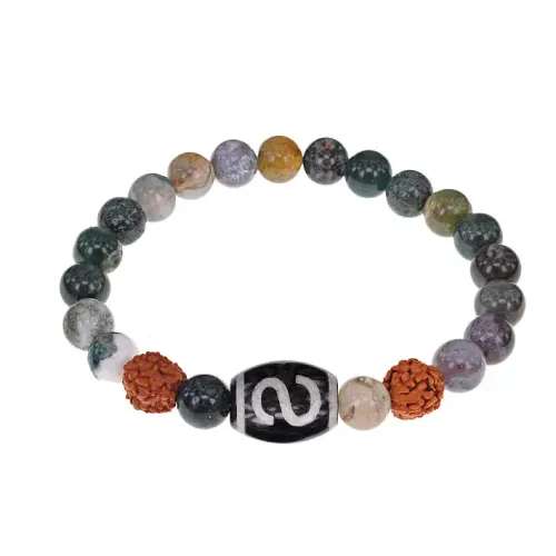 Браслет-амулет из натуральной рудракши, синтетического камня яшма и тибетской бусины Дзи из агата с символом Денежный крючок.