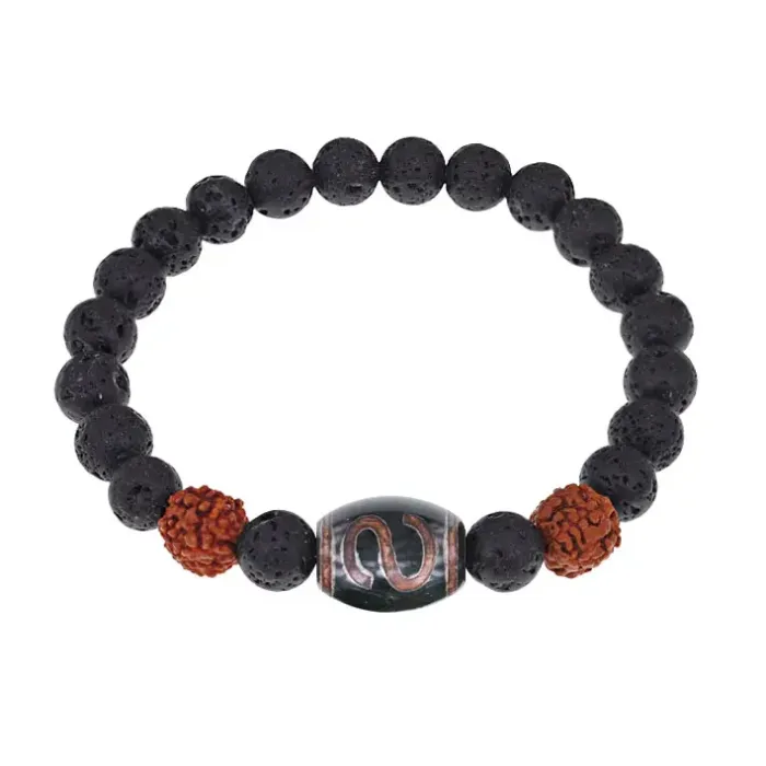 Стрейч-браслет для ношения в качестве украшения или сувенира. Изготовлен из натуральной рудракши, синтетического камня лава (базальт) и бусины Дзи из агата.