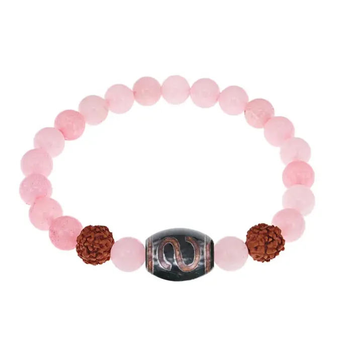 Браслет с Дзи Денежный крючок, нат. рудракшей и синт. камнем Розовый кварц BSDR-06-15