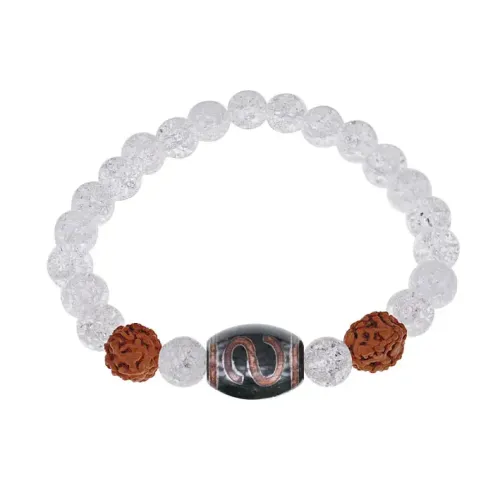 Стрейч-браслет с бусинами Дзи и рудракшей. Включает синтетический камень, имитирующий сахарный кварц, и бусину Дзи из агата.